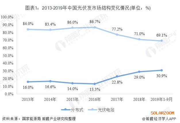 不同于光伏電站,分布式光伏發電是指在用戶所在場地或附近建設運行,以用戶側自發自用為主、多余電量上網且在配電網系統平衡調節為特征的光伏發電設施。近年來,國家對分布式光伏發電系統一直采取積極鼓勵的態度,并出臺了一系列扶持措施。2016年底出臺的《電力發展“十三五”規劃》對分布式光伏設定了超常規發展目標:“2020年,太陽能發電裝機達到1.1億千瓦以上,分布式光伏6000萬千瓦以上”。隨著各地分布式光伏發電建設的推進。我國光伏發電市場結構發生改變,尤其是2016年以來,我國分布式光伏市場份額已經由13.3%提升至30.9%。