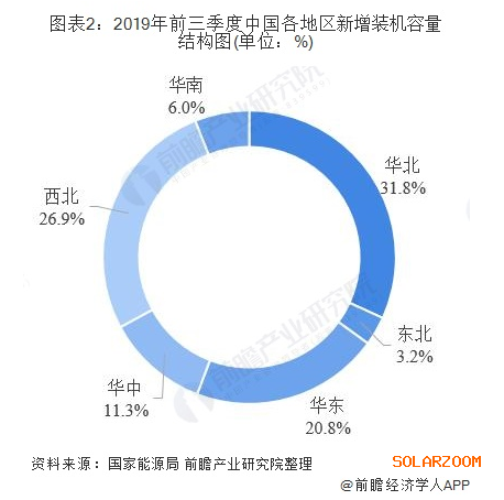 從新增裝機布局看,我國光伏發電由西向東的發展步伐穩步推進,2019年前三季度,華北地區新增裝機508.6萬千瓦,占全國的31.8%;東北地區新增裝機51.2萬千瓦,占全國的3.2%;華東地區新增裝機332.2萬千瓦,占全國的20.8%;華中地區新增裝機180.9萬千瓦,占全國的11.3%;西北地區新增裝機430.8萬千瓦,占全國的26.9%;華南地區新增裝機95.5萬千瓦,占全國的6%。