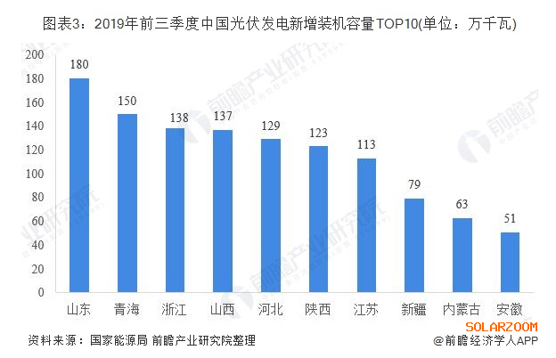 具體到各個省份來看,2019年前三季度,山東省新增裝機容量排名第一,達到180萬千瓦;青海和浙江緊隨其后,新增裝機容量分別為150萬千瓦和138萬千瓦。