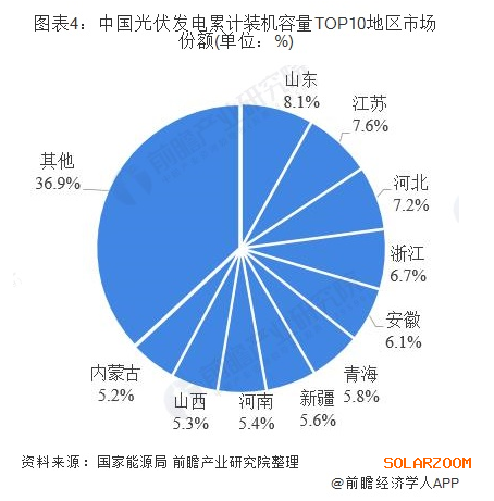 累計裝機容量方面,截至2019年第三季度,我國共有9個地區光伏發電累計裝機容量超過1000萬千瓦。其中山東以1541萬千瓦,排名第一,占全國總裝機容量的8.1%;江蘇和河北緊隨其后,分別以1445萬千瓦和1363瓦千瓦占全國總裝機容量的73.6%及7.2%。